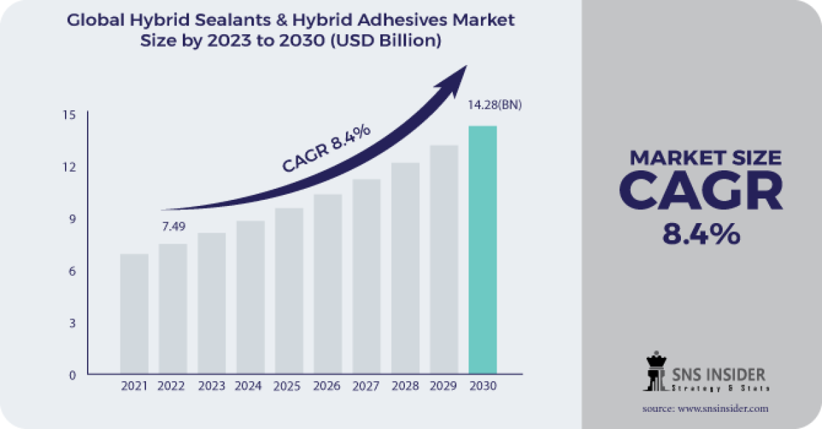 According to the SNS Insider, The Hybrid Sealants & Hybrid Adhesives Market is predicted to increase at a CAGR of 8.4% from 2023 to 2030, from USD 7.49 billion in 2022 to USD 14.28 billion in 2030. The hybrid sealants and adhesives market is on the rise, driven by the growing need for versatile and high-performance bonding and sealing solutions across various industries.
